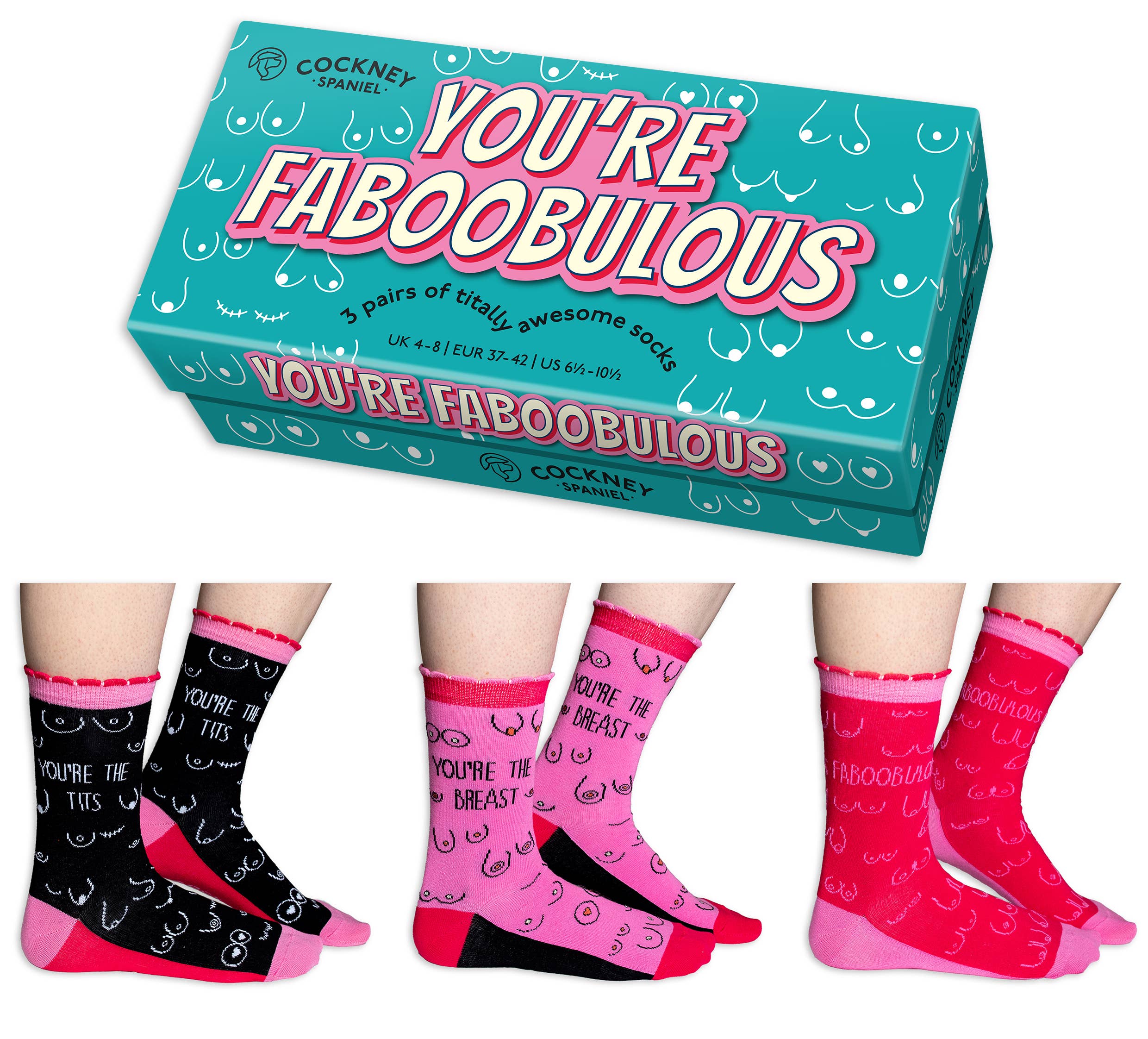 Who doesn't love a boob pun!? Three fantastic pairs of funny, boob-themed socks displayed beautifully in a bright and colourful box. A fantastic pressie for your other half, a thank you gift for a feminist or strong woman who deserves a pat on the back. Wear them proudly!